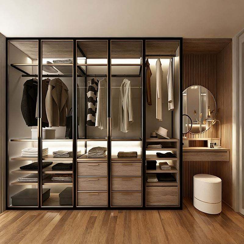 ตู้เสื้อผ้ากระจกหรูหราพร้อมกรอบทอง ตู้เสื้อผ้าแบบวอล์คอินพร้อมไฟ LED และลิ้นชัก