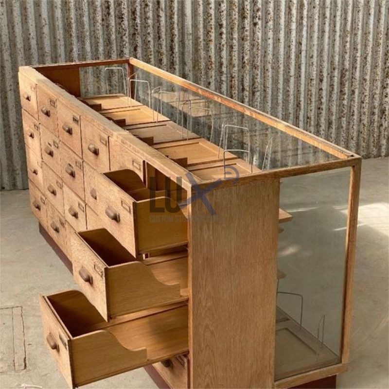 หรูหราเกรดสูงที่กำหนดเองร้านขายยาไม้ชั้นวางจอแสดงผลและชั้นวางเฟอร์นิเจอร์ร้านค้า