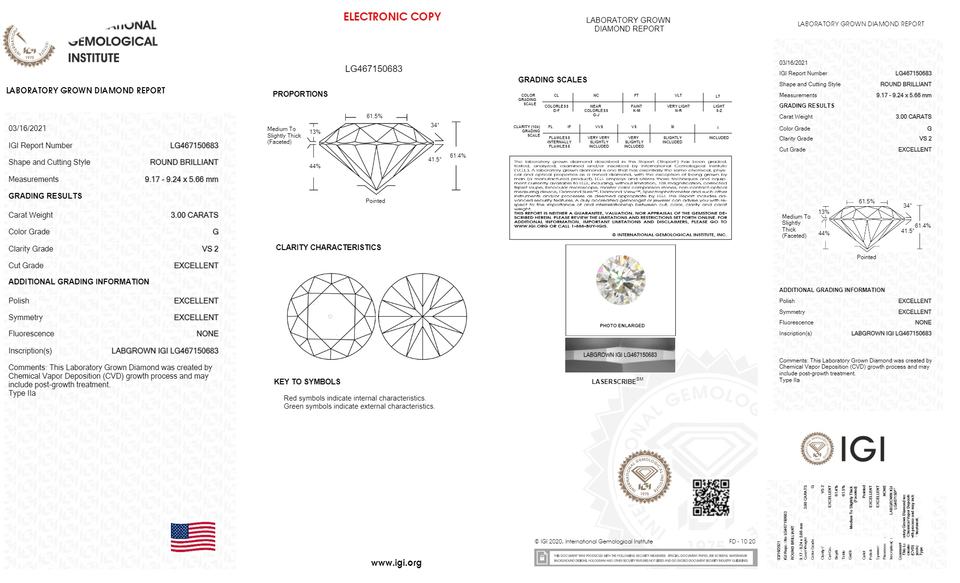 VS2เจียระไนทรงกลม3กะรัต G เพชรพลอยหลวมได้รับการรับรองจาก IGI