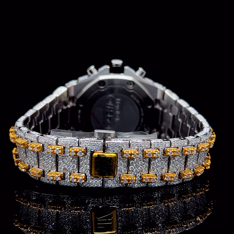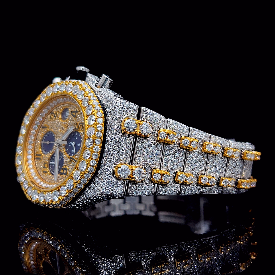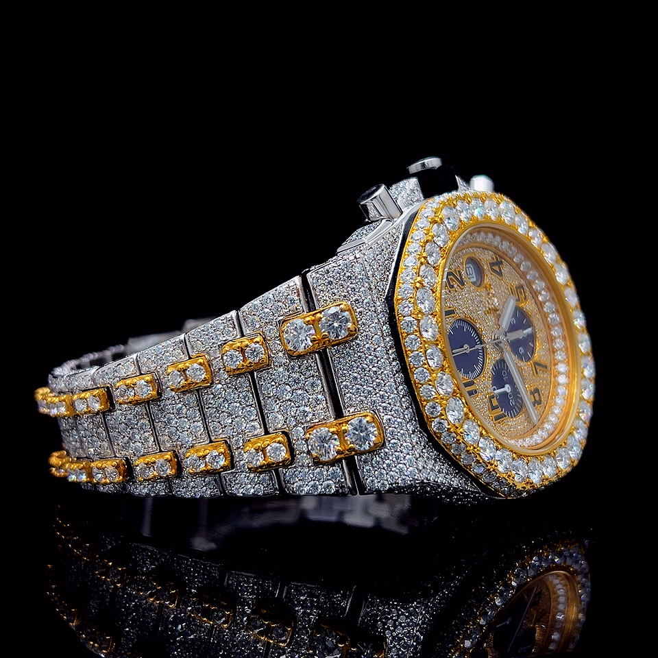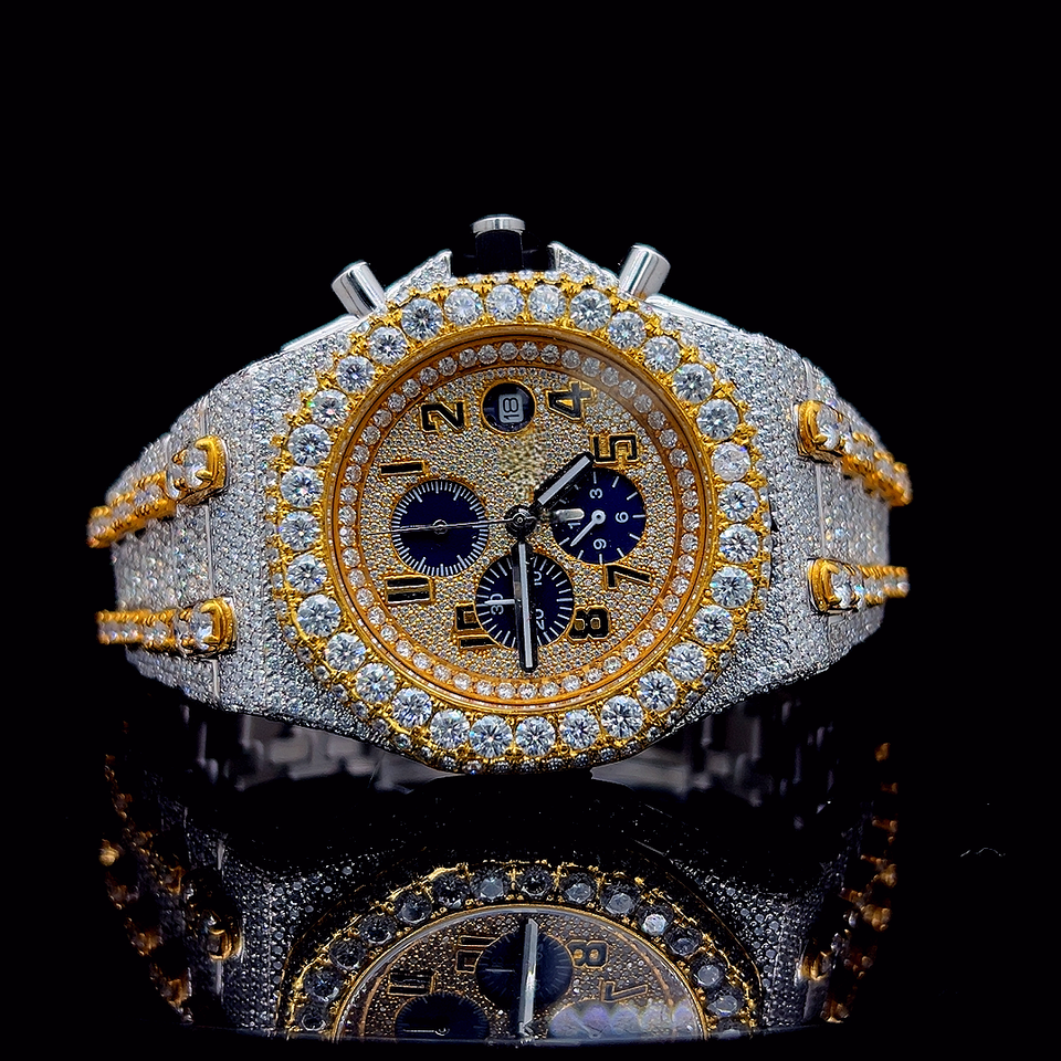 นาฬิกาสเตนเลสสตีลสุดหรูฮิปฮอปสุดเท่ VVS Moissanite หน้าปัดคำแบบแอนะล็อกหน้าต่างกระจก