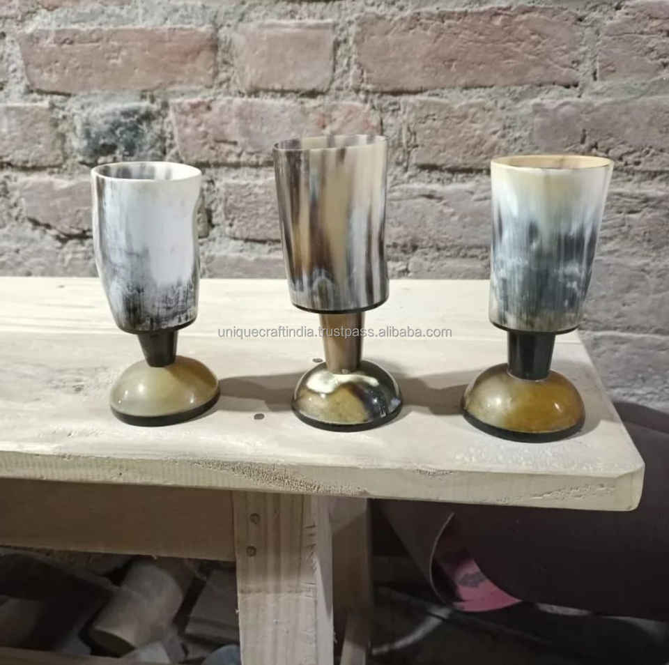 แก้วทัมเบลอร์ฮอร์นทำจากธรรมชาติแก้วลายเขาวัวพร้อมฐานไม้แท้ไวกิ้งยุคกลาง