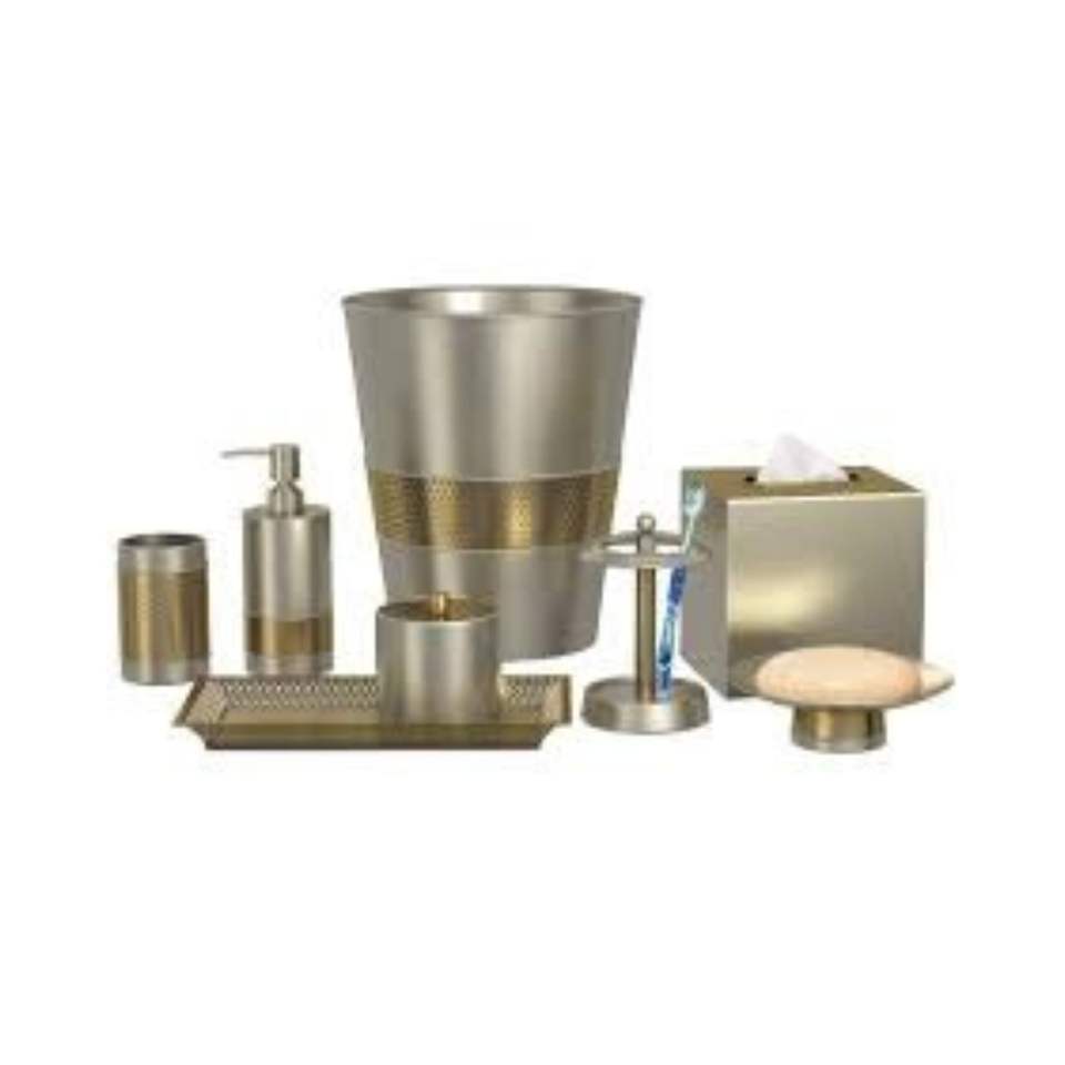 ชุดอุปกรณ์ห้องน้ำโลหะสำหรับโรงแรมหรู กล่องใส่กระดาษทิชชู่ ที่จ่ายสบู่เหลว ที่วางแปรงสีฟัน ถังขยะ