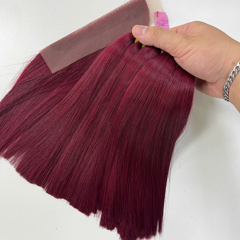 ชุดผมมนุษย์แบบมัดและปิดผมมนุษย์ทำจากลูกไม้โปร่งใสเนื้อตรงเงางามสีไวน์