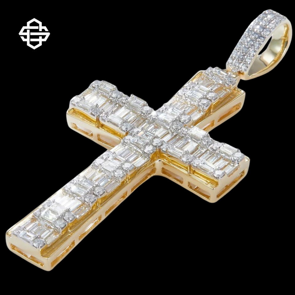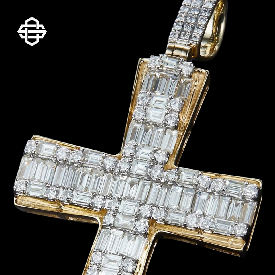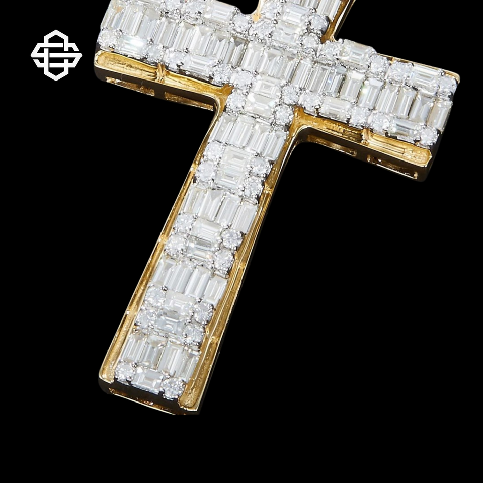 จี้เพชรทรงบาแกตต์รูปกากบาทสุดหรูสำหรับผู้ชาย ชุบทอง 18K โลหะผสม สไตล์ฮิปฮอป ประดับเพชรระยิบระยับ สร้อยคอคริสเตียน พร้อมใบรับรอง IGI
