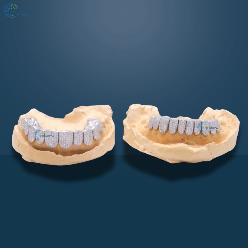 ที่ครอบฟันทำจากเพชรมออิสซาไนท์ด้านบนและล่างสุดหรูหราออกแบบได้เองหมวกฟันฮิปฮอปสไตล์แร็ปเปอร์ในทอง10K สีขาว