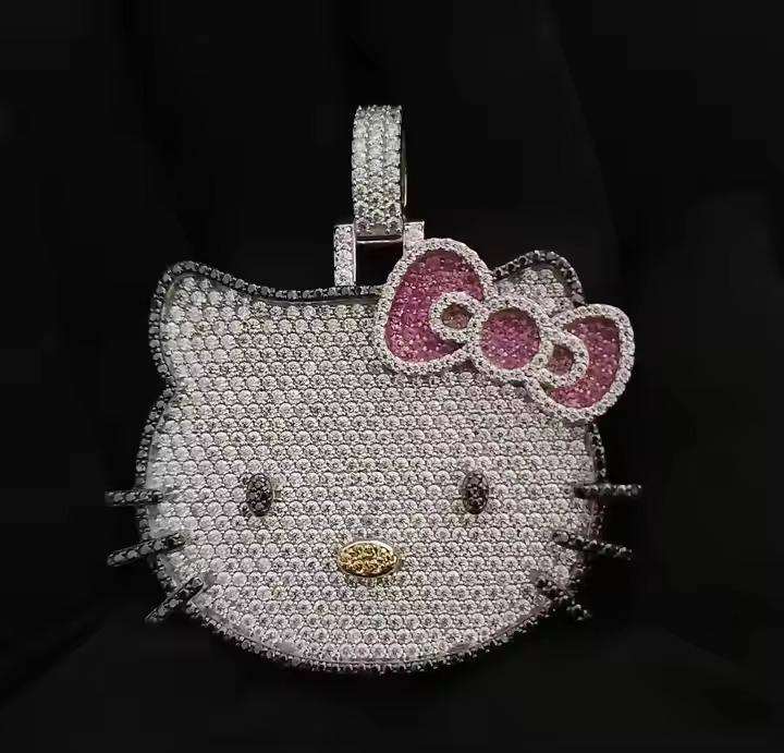 จี้รูปแมวประดับเพชร VVS มอยส์ซาไนต์ สไตล์ฮิปฮอปสุดหรู พร้อมโบว์สีชมพู ประดับเพชรแบบกำหนดเอง สีโรสโกลด์ สำหรับงานปาร์ตี้