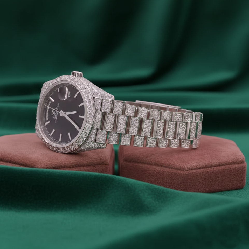นาฬิกาข้อมือผู้ชายสุดหรู หน้าปัดสีดำ แสดงวันที่ สายสแตนเลส ขอบเพชร ระบบออโตเมติก
