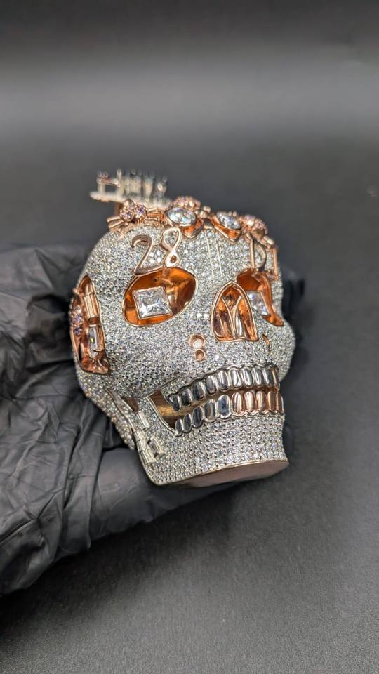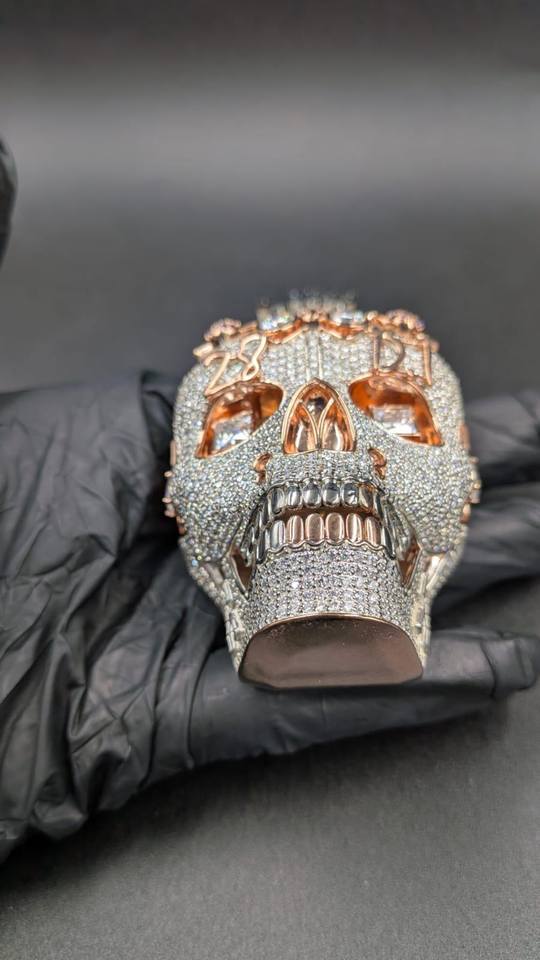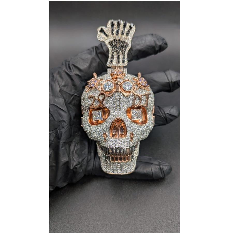 จี้หัวกะโหลกประดับเพชรหรูหรา พร้อมตกแต่งด้วยโรสโกลด์ ดวงตาและฟันฝังเพชร เครื่องประดับฮิปฮอปสุดโดดเด่น