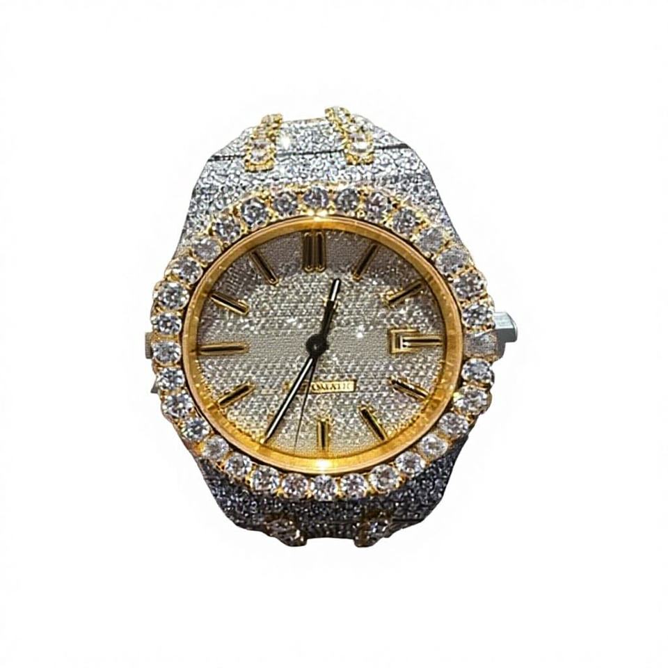 นาฬิกาหรูหราประดับเพชรโมอิสซาไนต์สีเหลืองทอง พร้อมสายสแตนเลสสตีล หน้าปัดกระจกทรงกลม กันน้ำ 10 บาร์ ตัวล็อคสายแบบกำไลข้อมือ ผลิตในอินเดีย