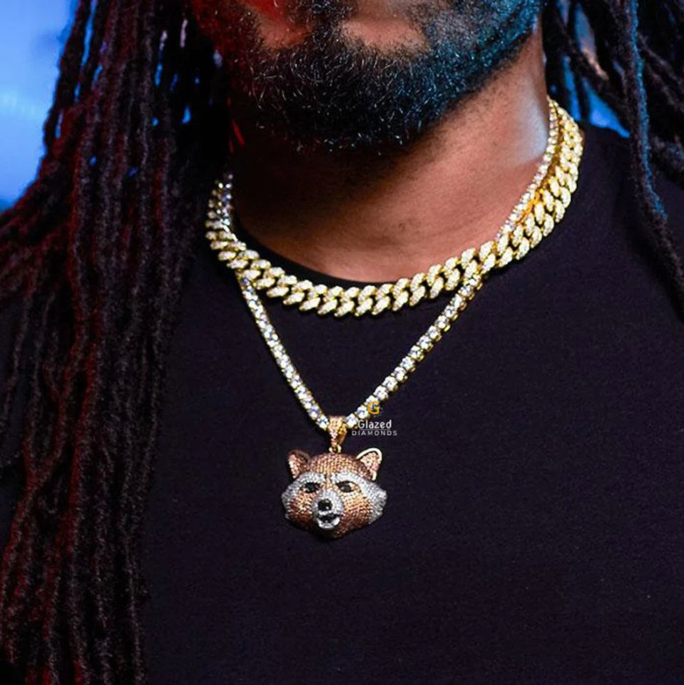 หรูหราใน10kt สีเหลืองทองประดับด้วยชุดที่ยอดเยี่ยมของจี้แรคคูนจรวดที่ปลูกในห้องทดลองที่เต็มไปด้วยเพชร