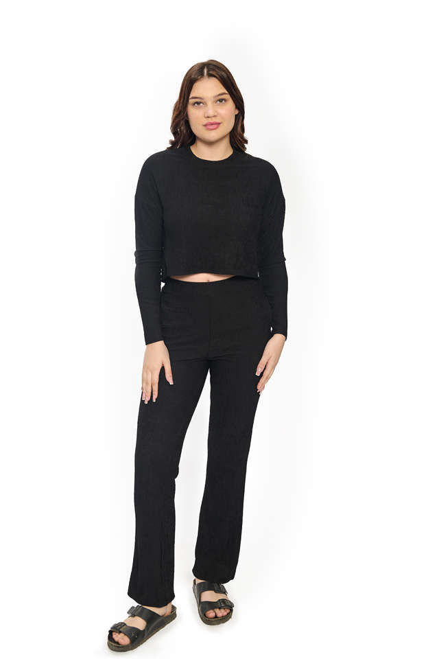 ชุดผ้าแจ็คการ์ดสุดหรูสำหรับผู้หญิงชุดเสื้อกางเกงขาบานแบบถักเครื่องแต่งกายสองชิ้นคอกลมแบบลำลองมีสไตล์