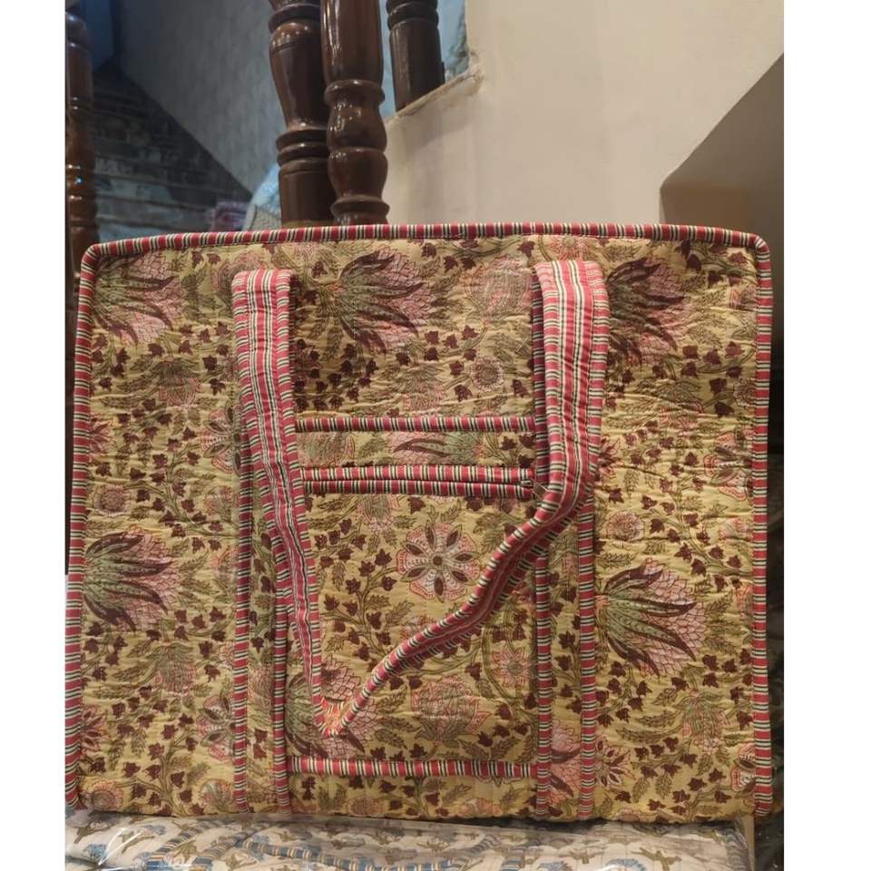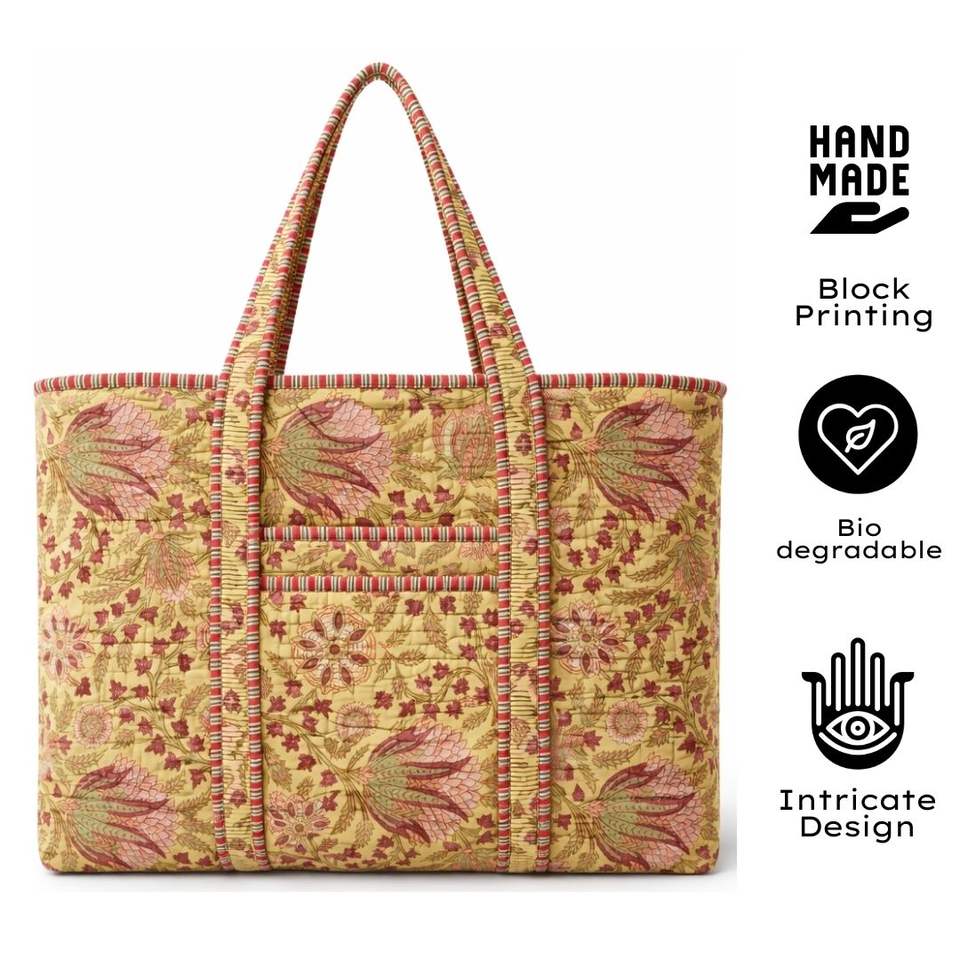 กระเป๋าโท้ททรงเหลี่ยมพิมพ์ลายบล็อกทำมือจากเมืองชัยปุระสุดหรู พร้อมซิปปิด ช่องใส่ของอเนกประสงค์ ใช้ได้ทุกฤดู ซักเครื่องได้