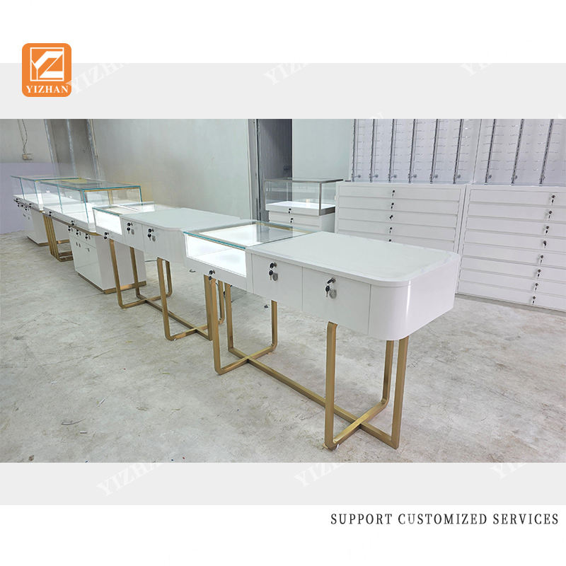 เคาน์เตอร์กระจกไฟ LED หรูหราแบบกำหนดเองสำหรับร้านเครื่องประดับร้านค้าปลีกหรือห้างสรรพสินค้าที่ออกแบบโดย Low Studio