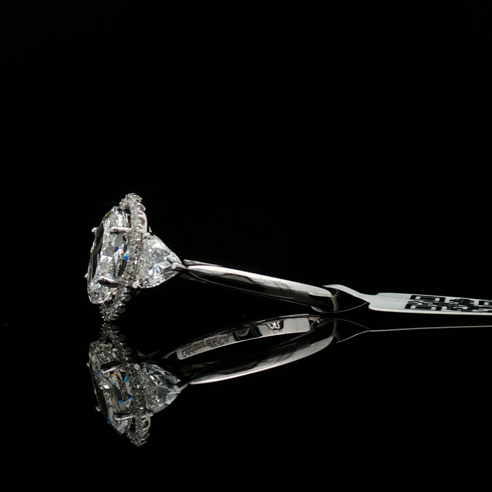 แหวนหมั้นเพชรทรงรีเพาะเลี้ยงในห้องปฏิบัติการสุดหรู ประดับด้วยเพชรทรงทริลเลียนและทรงกลมด้านข้าง ทำจากทองคำขาว 14 กะรัต | เพชรชีทัล