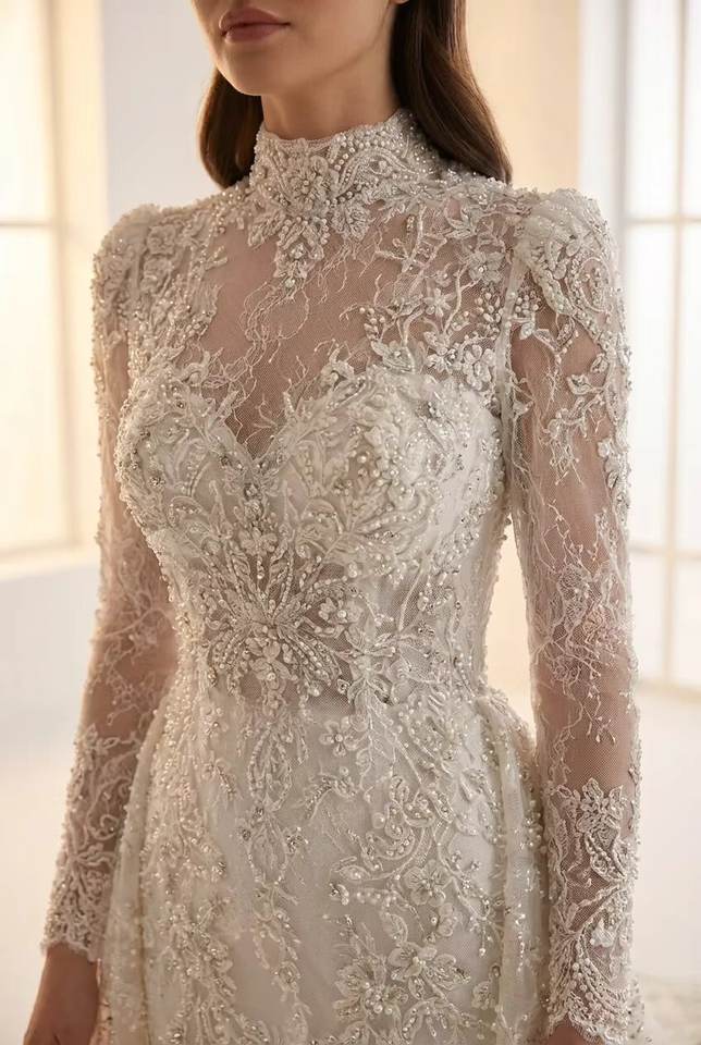 ชุดแต่งงานลูกไม้หรูหราประดับด้วยลายฉลุ แขนยาว พร้อมชายกระโปรงยาว ผู้ผลิตแบบ OEM