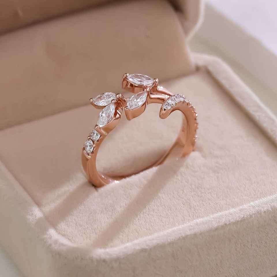 แหวนเพชรสำหรับผู้หญิงสำหรับงานแต่งงานงานหมั้นชุบโรเดียมโรสโกลด์14K ทรงใบไม้หรูหราประดับเพชร