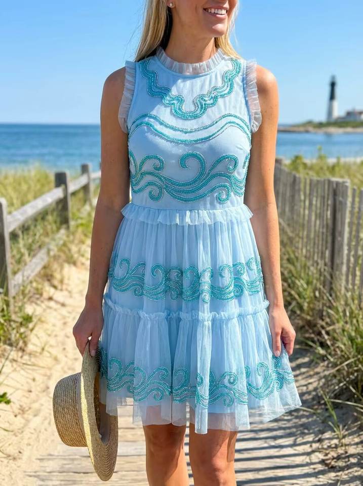 ชุดมินิเดรสผ้าทูลล์สีฟ้าอ่อนประดับลูกปัด ลายคลื่นทะเล สำหรับงานเลี้ยงค็อกเทล ขายส่งจากผู้ผลิต