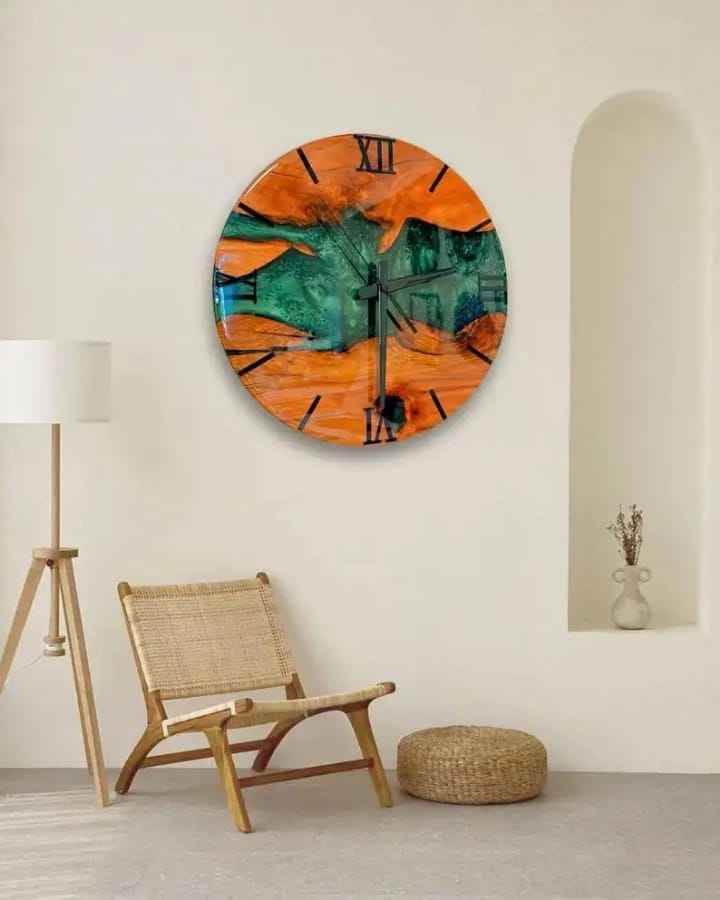 นาฬิกาแขวนผนังเรซิ่นอีพ็อกซี่สีฟ้าอมเขียวหรูหรา พร้อมแผ่นไม้ขอบธรรมชาติ รูปทรงกลม เงียบไร้เสียงรบกวน เหมาะสำหรับตกแต่งบ้านและสำนักงานสไตล์โมเดิร์น