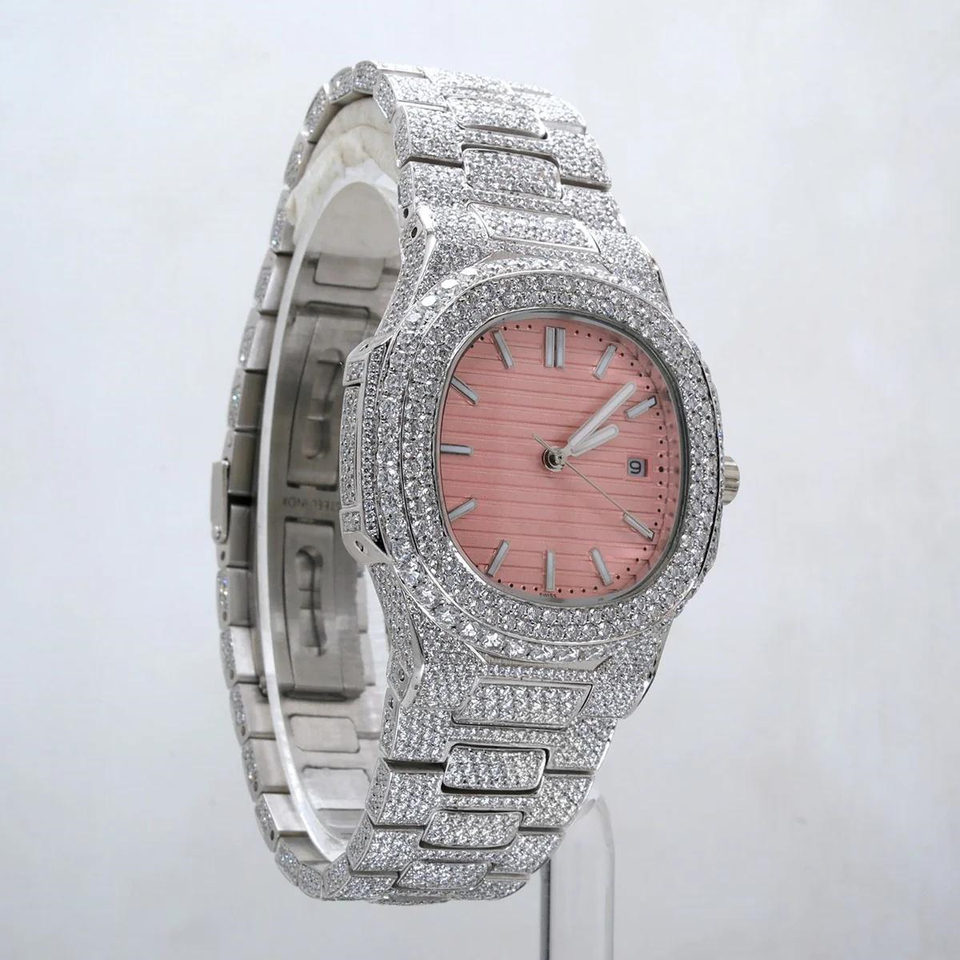 นาฬิกาสแตนเลสสตีลรุ่นลิมิเต็ดอิดิชั่นสุดหรู หน้าปัดสีชมพู ขนาด 40 มม. ตัวเรือนทรงเหลี่ยม ระบบอัตโนมัติ พร้อมประดับเพชร VVS