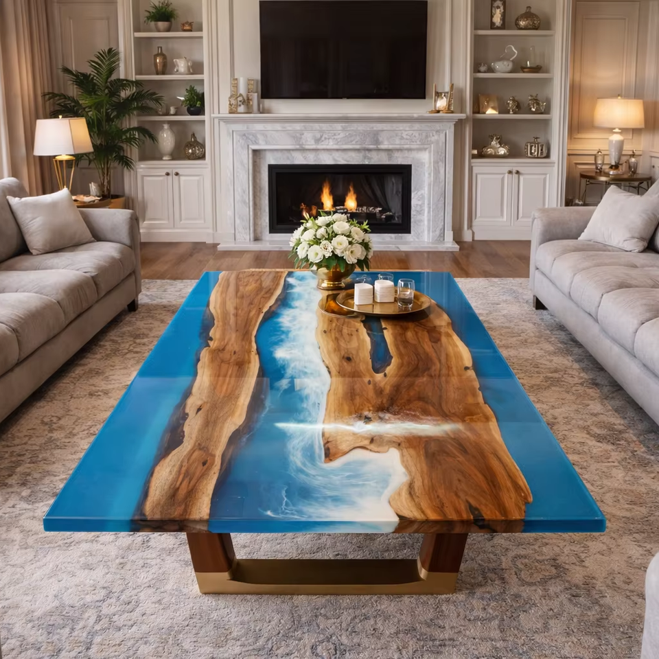โต๊ะรับประทานอาหารไม้วอลนัทขอบธรรมชาติสุดหรู พร้อมเรซิ่นอีพ็อกซี่สีน้ำเงินลายแม่น้ำ งานสั่งทำพิเศษ เฟอร์นิเจอร์สำนักงานสไตล์โมเดิร์นทำมือ