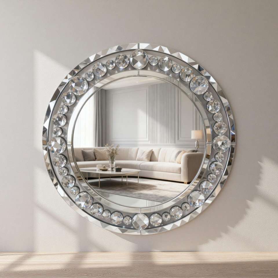 Luxury Living Room Home Decor Glamorous Circular Crystal-Inlaid Wall-Mounted Decorative Mirror Crystal Diamond Wall Mirror
