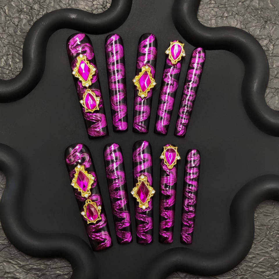 ชุดเล็บโลงศพทรงสี่เหลี่ยมยาวสุดหรูลายดอกกุหลาบผสมสีดำเพชรออร่าเก๋ไก๋ทันสมัยเล็บพลาสติก ABS แบบกดบนเล็บ