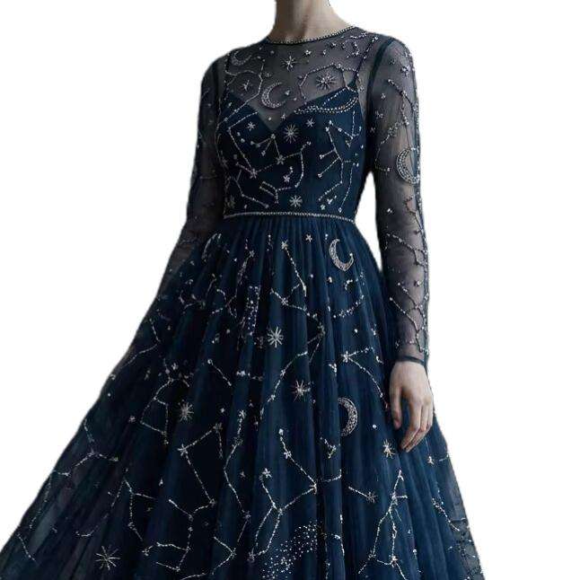 ชุดราตรีสีน้ำเงินกรมท่าประดับด้วยลูกปัดลายกลุ่มดาว แขนยาว ผ้าทูลล์ สำหรับงานพรอม ผลิตโดยผู้ผลิตสินค้าหรูหรา คุณภาพสูง ตัดเย็บตามสั่ง