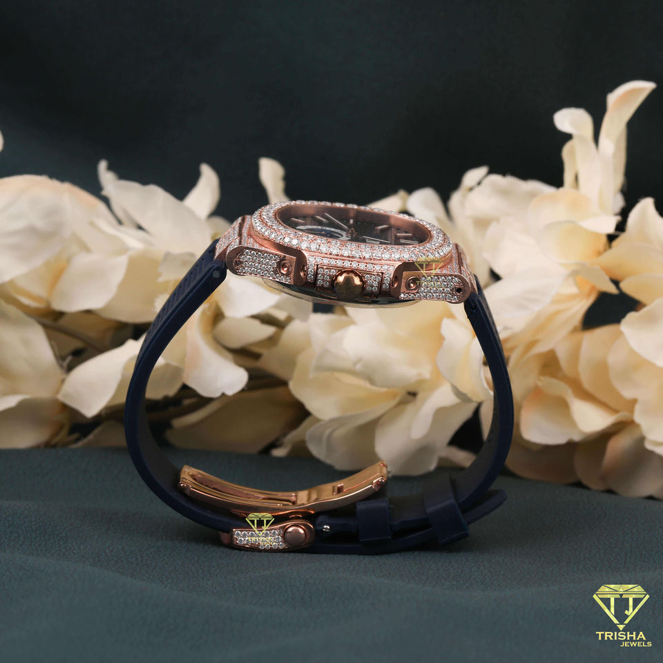 นาฬิกากระจกอะนาล็อกสำหรับผู้ชายแบบหรูหราขนาด41มม. สายหนังสีฟ้าประดับเพชรตัดเพชรขนาดกว้าง22มม. สไตล์ฮิปฮอปโรมันขนาด42มม.