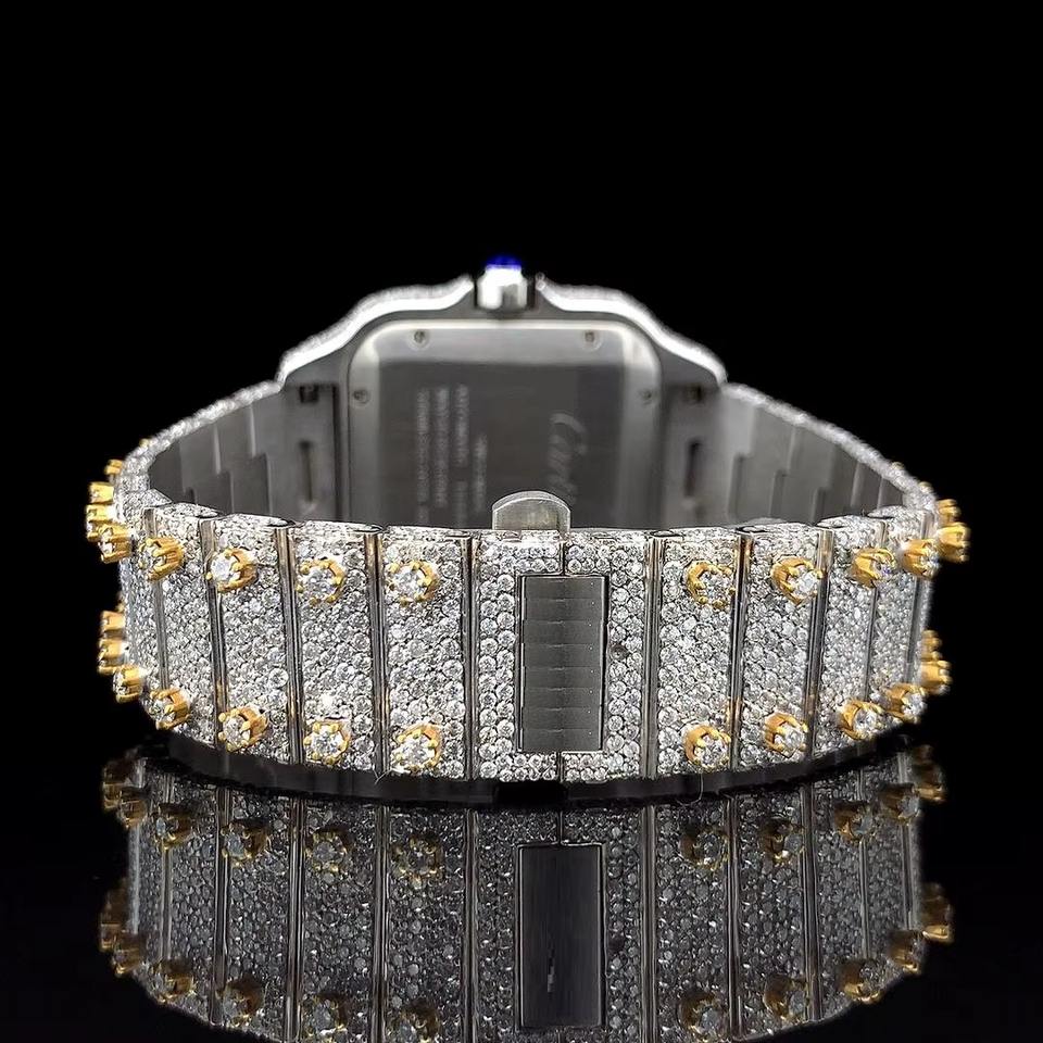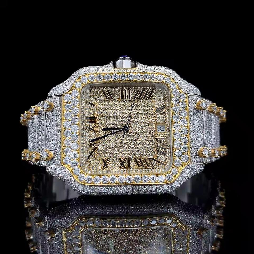 นาฬิกาข้อมือผู้ชายสุดหรู ดีไซน์คลาสสิก หน้าปัดประดับเพชรเต็มหน้าปัด ตัวเลขโรมัน ขอบตัวเรือนสีทอง ระบบควอตซ์ สไตล์ไอซ์ รุ่นลิมิเต็ด