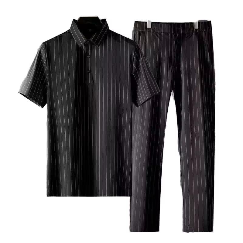 ชุดเสื้อผ้าผู้ชายสุดหรูเสื้อโปโลลายทางแบบสองชิ้นกางเกงระบายอากาศได้ดีแบบถักสไตล์ฤดูร้อน