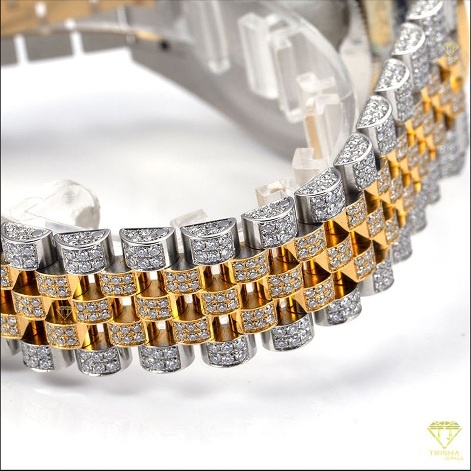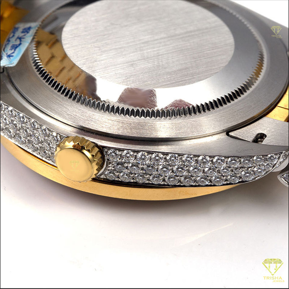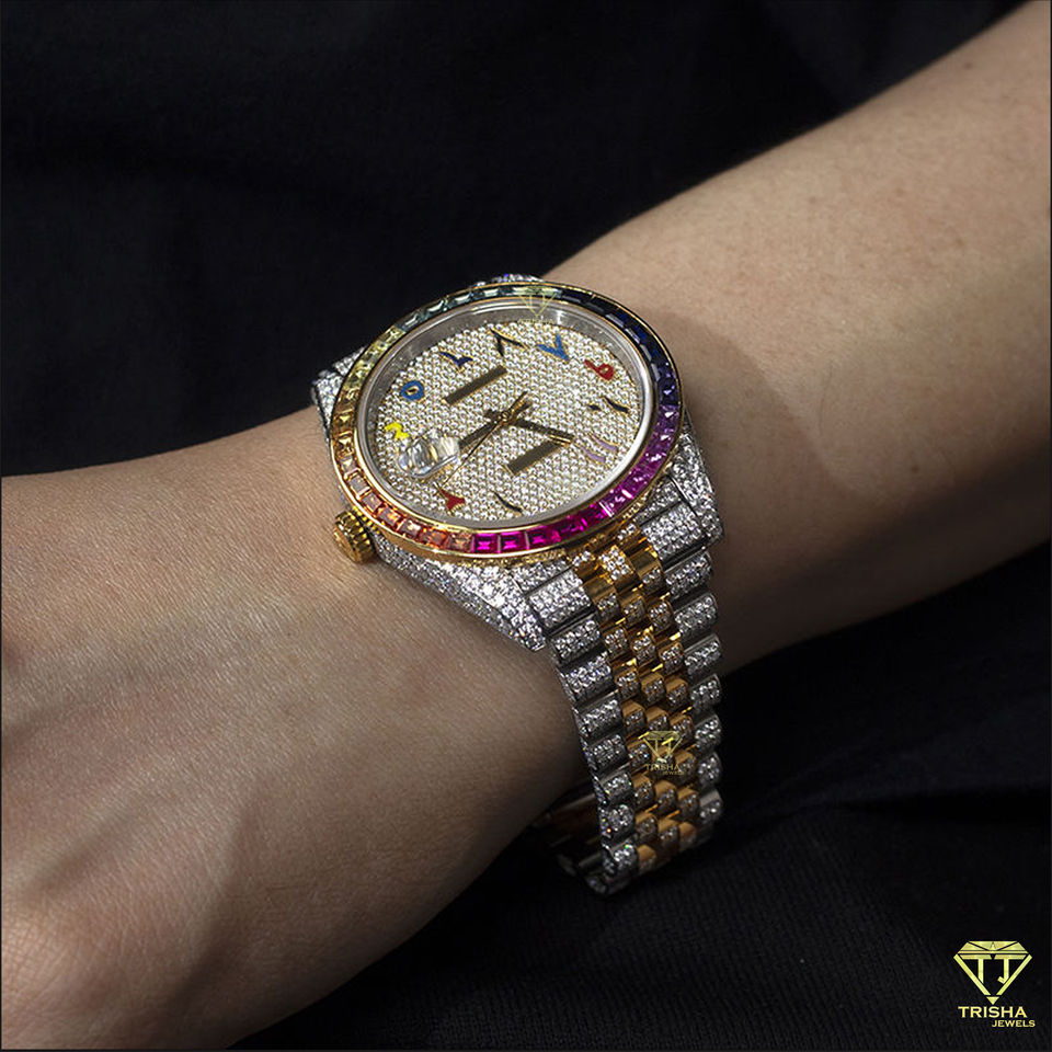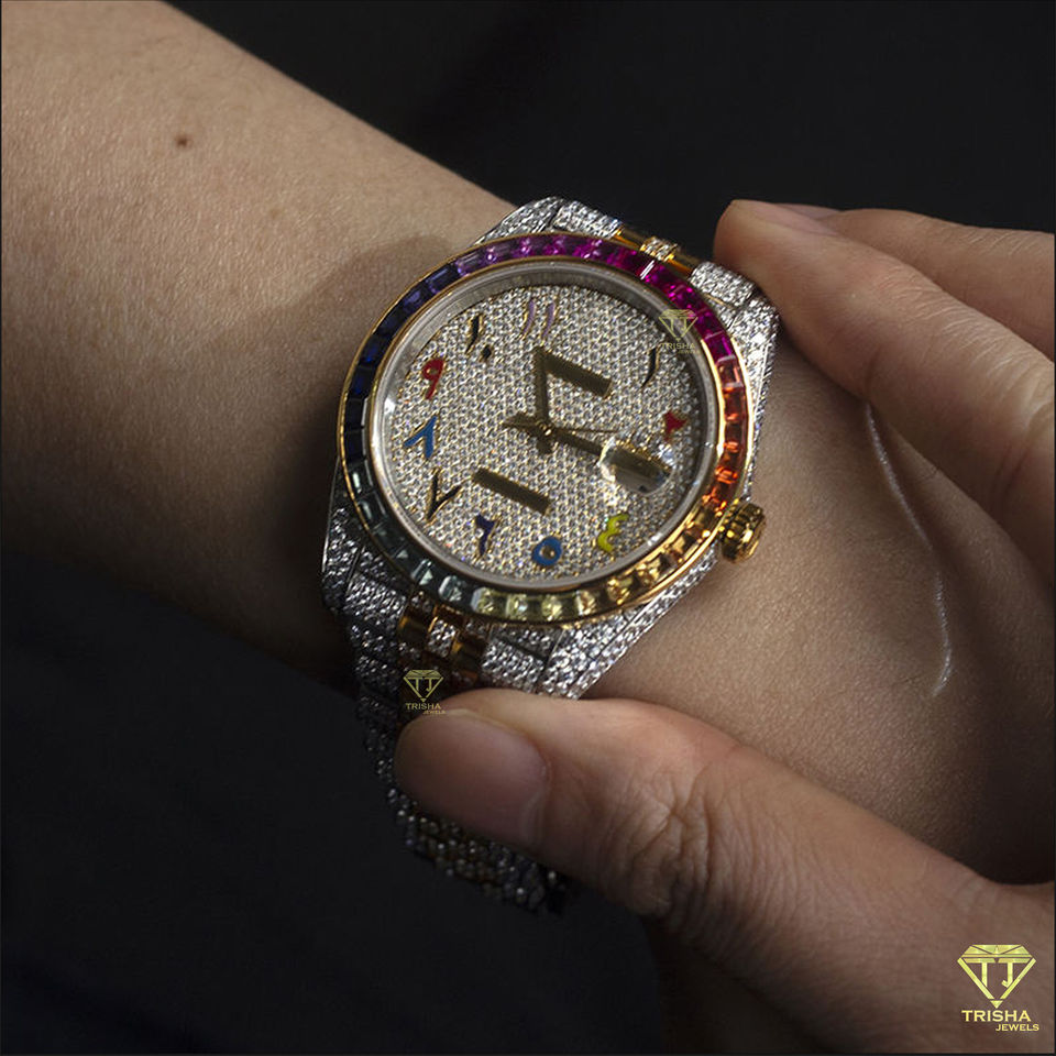 นาฬิกากลไกสไตล์ฮิปฮอปสุดหรูสำหรับผู้ชาย20มม. กำหนดเองได้สไตล์ฮิปฮอปเย็นเพชร VVS Moissanite ขอบสีรุ้งทำจากสเตนเลสสตีล
