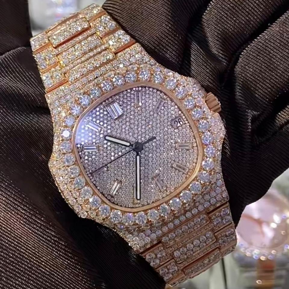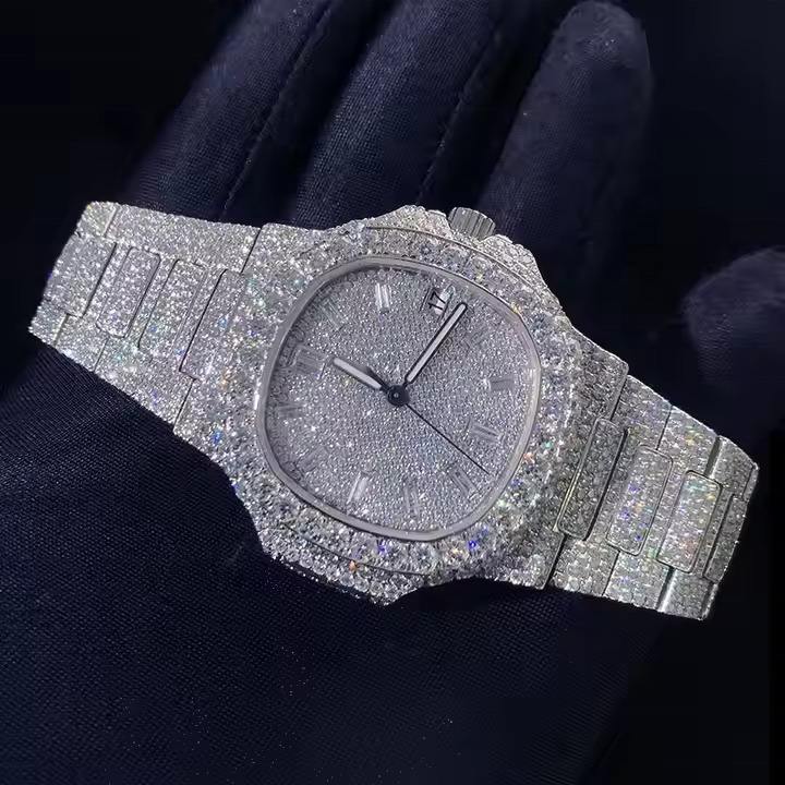 นาฬิกาข้อมือผู้ชายสุดหรู ระบบจักรกล ประดับเพชรโมอิสซาไนต์ VVS ตัวเรือนสแตนเลสสตีล ดีไซน์แบบ Iced Out สไตล์แร็ปเปอร์ โดดเด่นสะดุดตา ผ่านการตรวจสอบคุณภาพเพชร