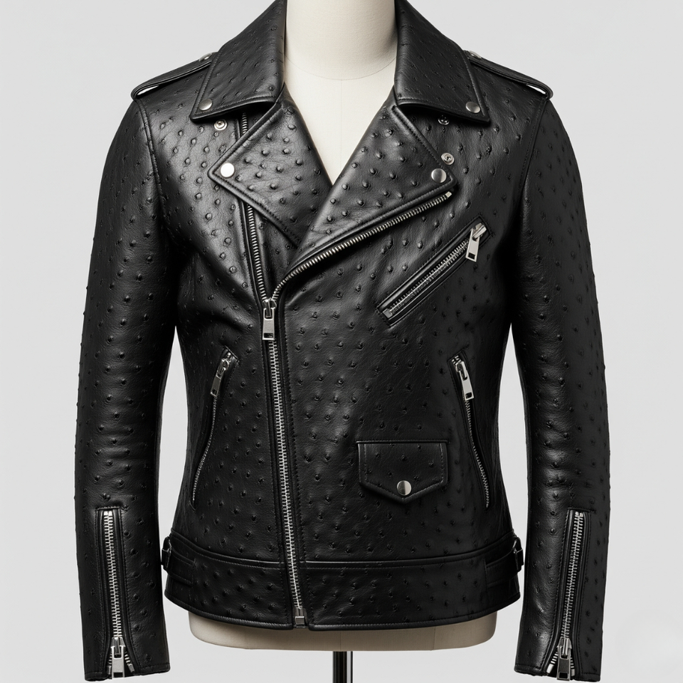 แจ็กเก็ตหนังนกกระจอกเทศสำหรับผู้ชายหรูหราเสื้อแจ๊กเก็ตหนังแท้สีดำพิมพ์ลายนกกระจอกเทศ