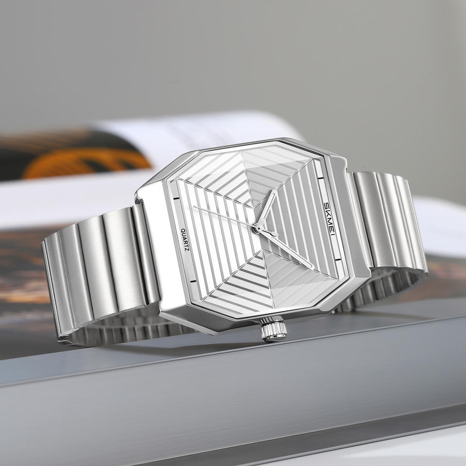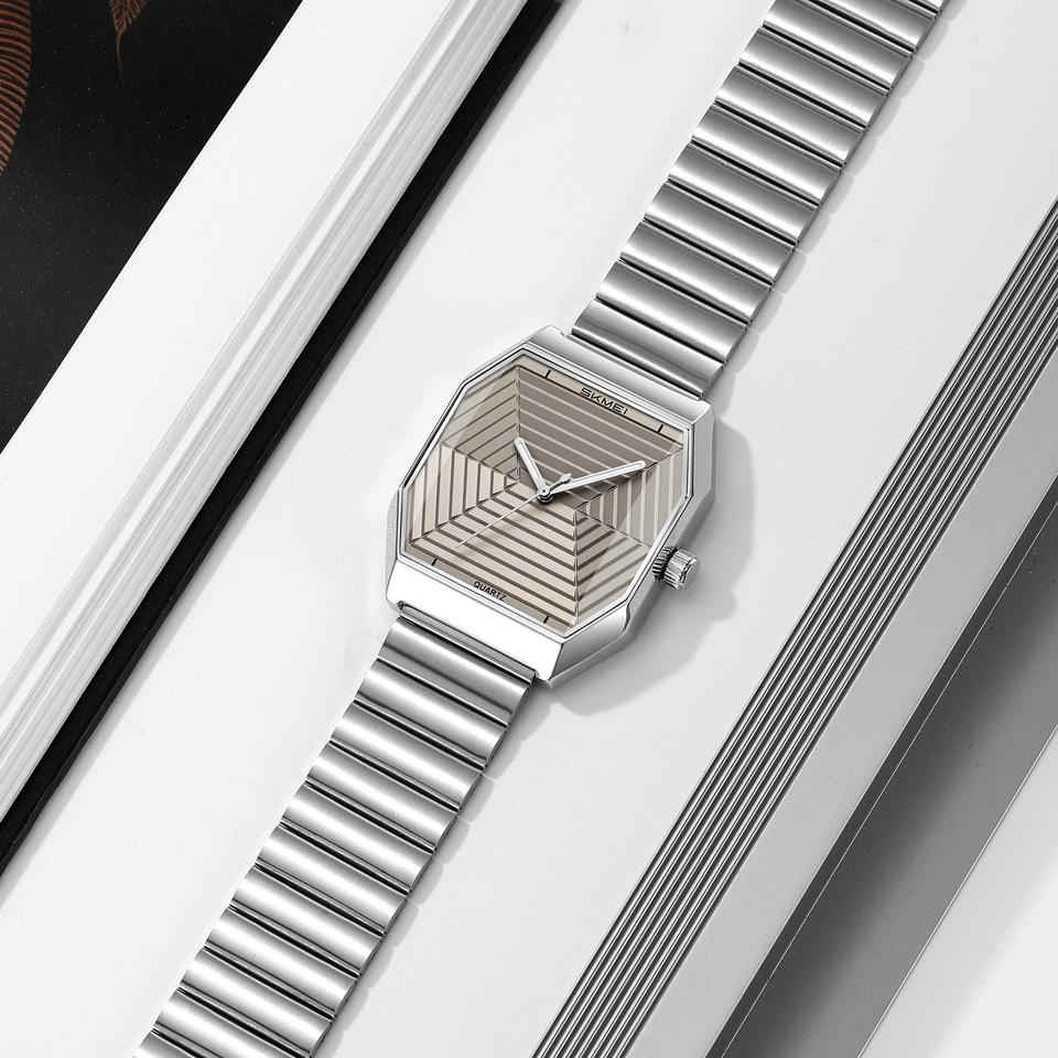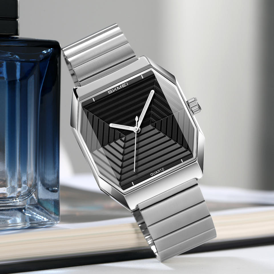 นาฬิกาควอตซ์ผู้ชายสุดหรู OEM/ODM โลโก้สั่งทำ สายสแตนเลส หน้าปัดลายเรขาคณิตสุดพิเศษ นาฬิกาข้อมือธุรกิจ ขายส่ง