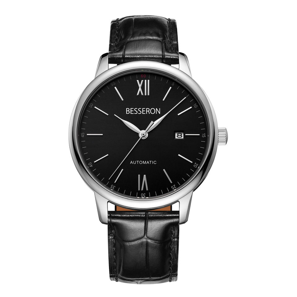 นาฬิกาข้อมือผู้ชายสุดหรู ระบบอัตโนมัติ กลไกจักรกล พร้อมเข็มเรืองแสง สายหนังสีดำ ตัวเรือนเหล็ก แบรนด์ OEM หน้าปัดแบบกำหนดเอง ดีไซน์โปร่ง