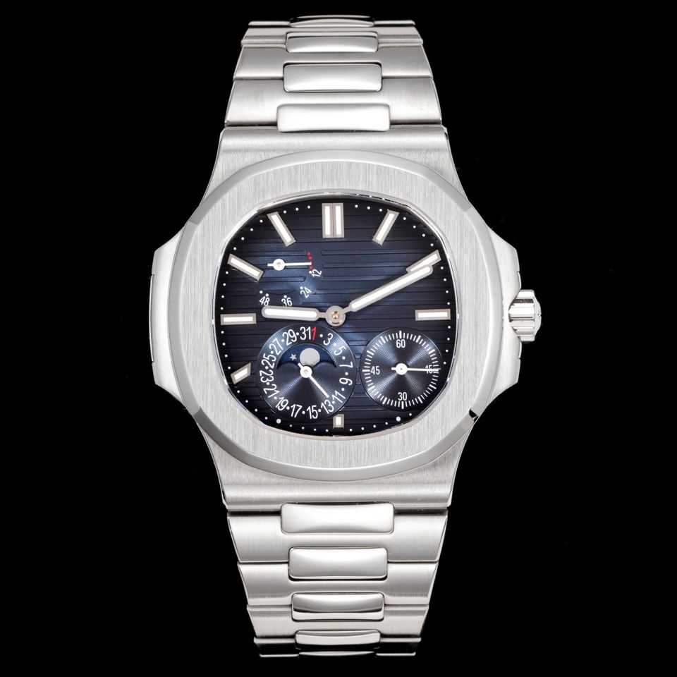 Luxury Men's Square Automatic Wristwatch Stainless Steel Bracelet Navy Blue Dial Moonphase Chronograph Mechanical Wristwatch
