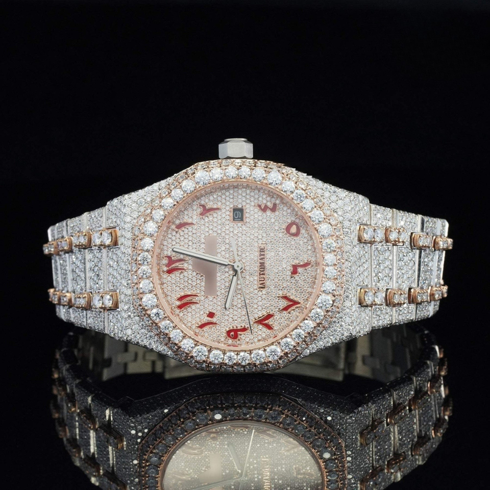 นาฬิกาผู้ชายหรู Moissanite เคลื่อนไหวอัตโนมัติเพชรเย็นมีลักษณะเป็นตัวเลขอารบิกสีแดง22มม. ควอตซ์สไตล์ธุรกิจกันน้ำ