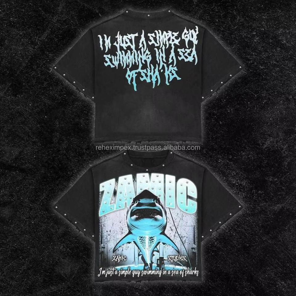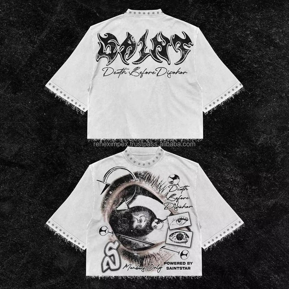 เสื้อยืดวินเทจทรงหลวมสไตล์ลักซ์ชัวรี่สำหรับผู้ชาย ผ้าคอตตอน 100% หนัก 300 กรัม แห้งเร็ว ระบายอากาศดี ประดับด้วยคริสตัลติดมือ