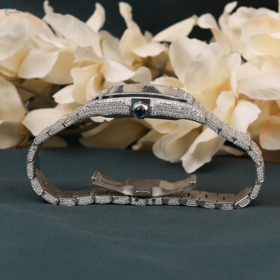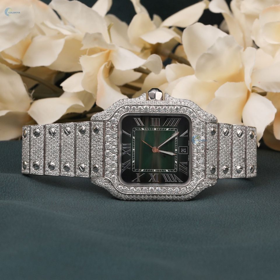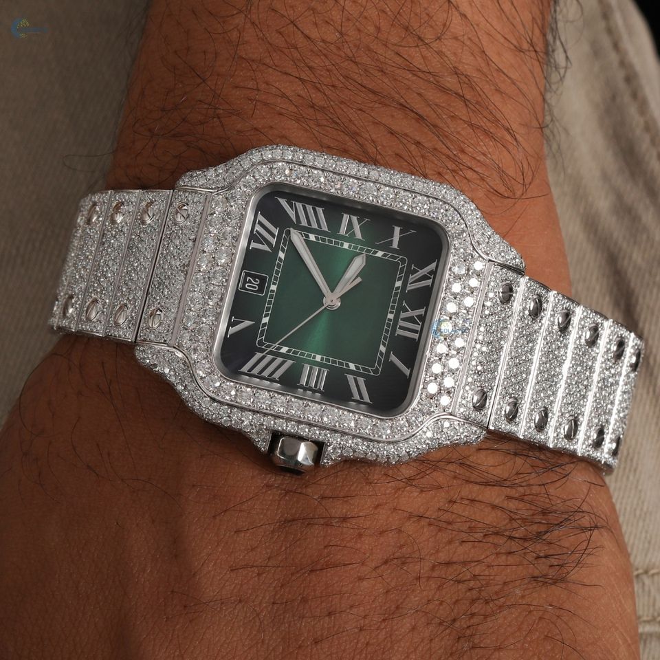 นาฬิกาเพชรหรูหราสำหรับผู้ชายนาฬิกาข้อมือสำหรับใส่ออกงานแสดงตัวเลขโรมันพร้อมนาฬิกาหน้าปัดสีเขียว
