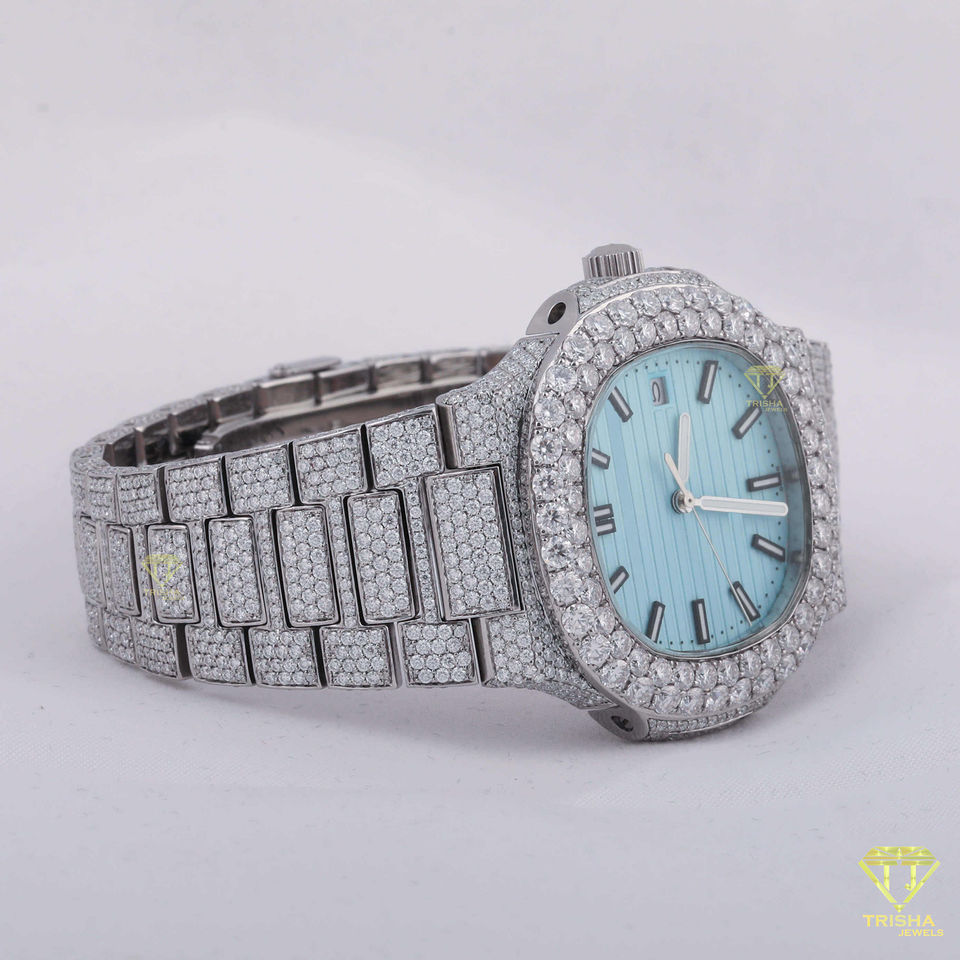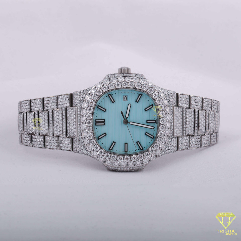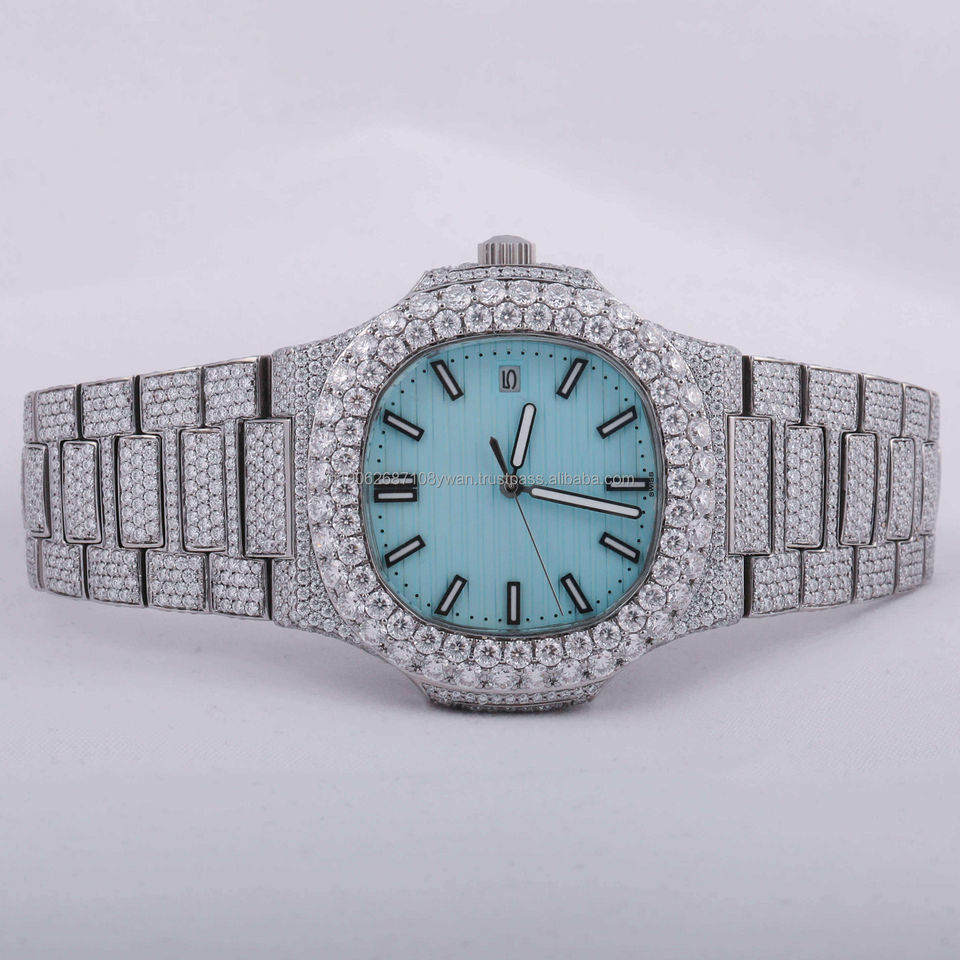 นาฬิกาข้อมือผู้ชายสุดหรู สแตนเลสสตีล หน้าปัดสีน้ำเงิน ประดับเพชรเลี้ยงในห้องปฏิบัติการ ดีไซน์โบราณเต็มรูปแบบ หน้าปัดกระจก ดีไซน์โดดเด่นจากอินเดีย