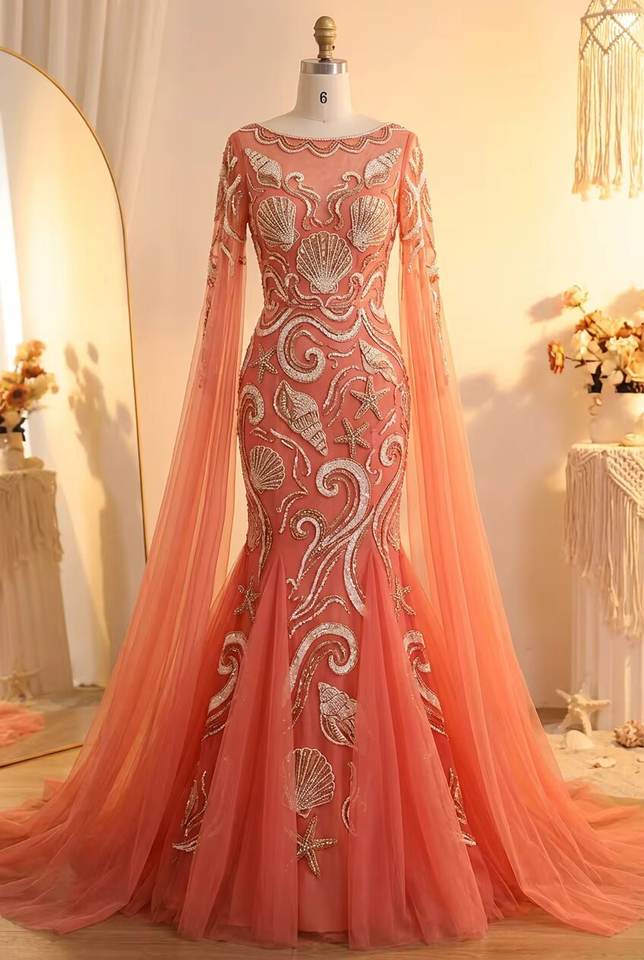ชุดราตรีทรงเมอร์เมดหรูหราประดับด้วยลูกปัดเปลือกหอย แขนเสื้อคลุมยาว สง่างาม ยาวถึงพื้น เหมาะสำหรับงานพรอมและโอกาสพิเศษ