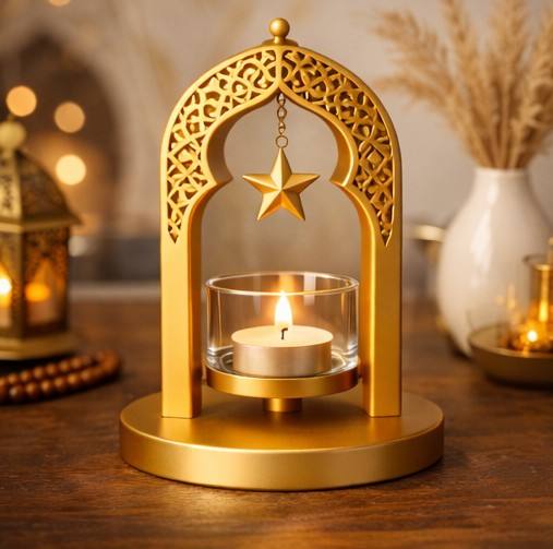 เชิงเทียนโลหะหรูหรา ตกแต่งบ้านสไตล์อิสลามสำหรับรอมฎอนและอีด ของตกแต่งโต๊ะระดับพรีเมียม รูปทรงโคมไฟ