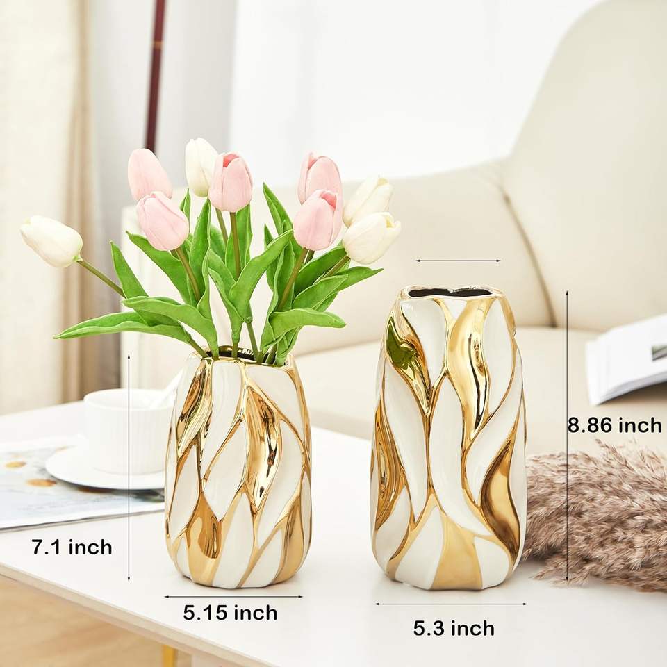 แจกันดอกไม้โลหะสุดหรูพร้อมผิวเคลือบเซรามิก | ของตกแต่งที่เน้นสีทองกลางสำหรับบ้านโรงแรมและอีเวนต์