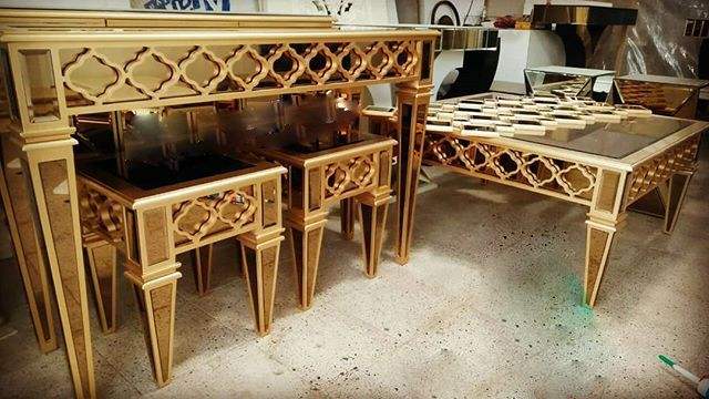 ชุดเฟอร์นิเจอร์ห้องนั่งเล่นสไตล์ตะวันออกกลางสุดหรู ทันสมัย ทำจากไม้ MDF สีทอง พร้อมโต๊ะกาแฟและโต๊ะข้างแบบมีกระจก 2+1 ชิ้น
