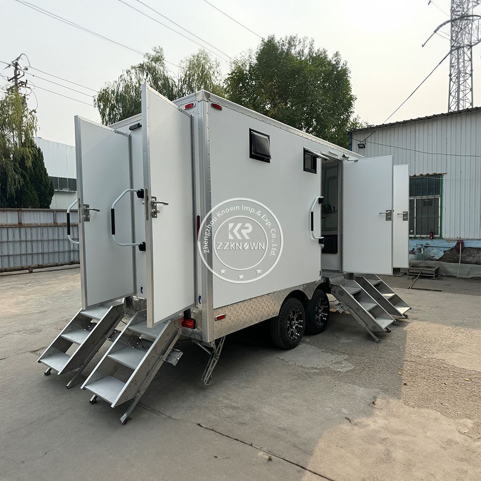 รถพ่วงห้องน้ำเคลื่อนที่หรูหรา 2 ห้อง แบบกลางแจ้ง เป็นมิตรกับสิ่งแวดล้อม ห้องน้ำสำเร็จรูปสำหรับงานก่อสร้าง