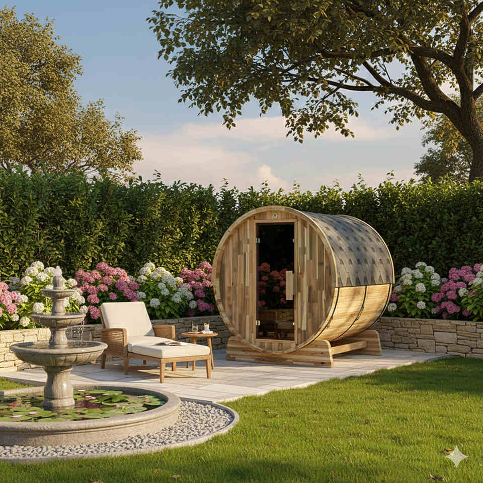 ห้องซาวน่าไม้ทรงกระบอกสำหรับ 4 คน สไตล์โมเดิร์นหรูหรา สำหรับสวนหลังบ้าน พร้อมประตูกระจกมองวิวพาโนรามา ทนทานต่อสภาพอากาศ หลังคากระเบื้องยางมะตอย