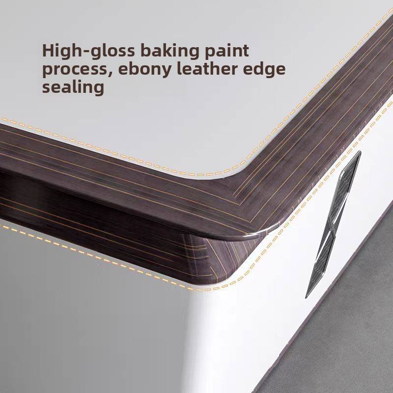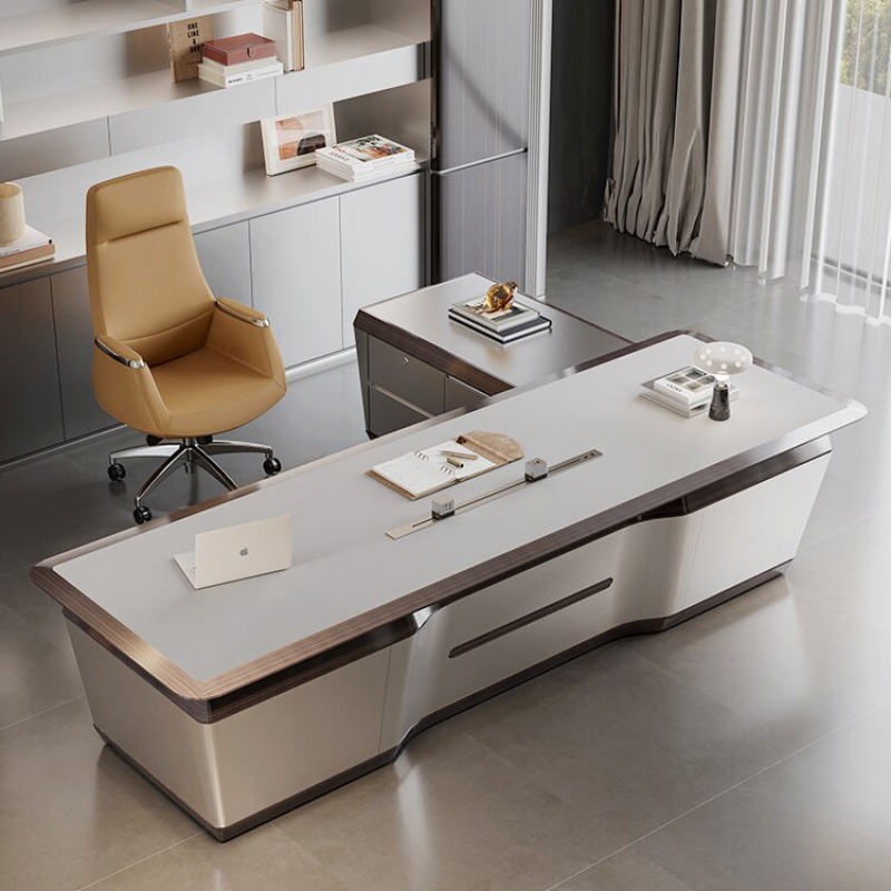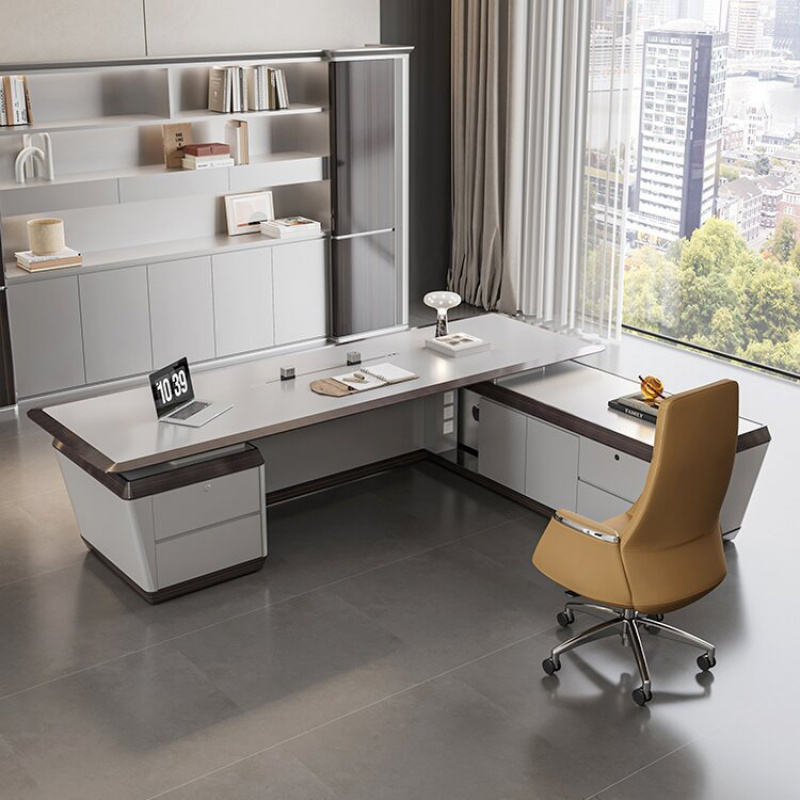 ชุดเฟอร์นิเจอร์สำนักงานผู้บริหารระดับสูง ดีไซน์หรูหราทันสมัย โต๊ะทำงานประธานขนาดใหญ่ทำจากไม้ พร้อมตู้ข้างและเก้าอี้หนัง