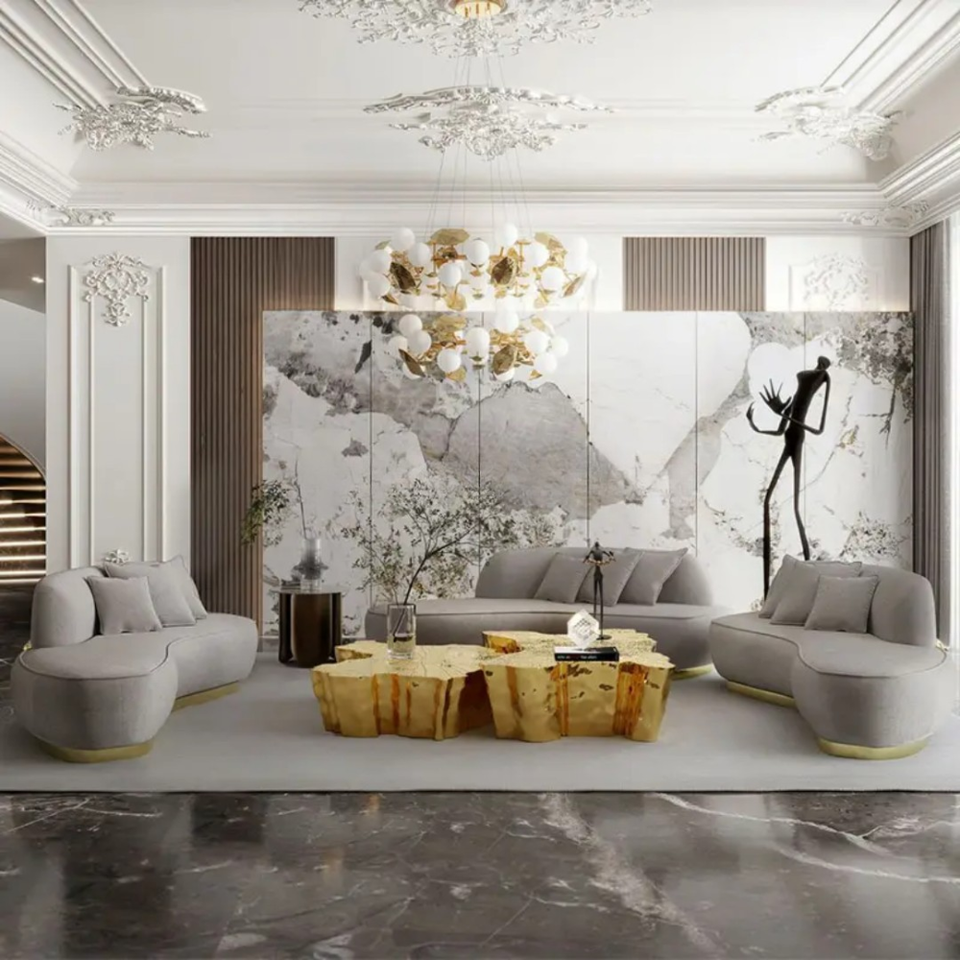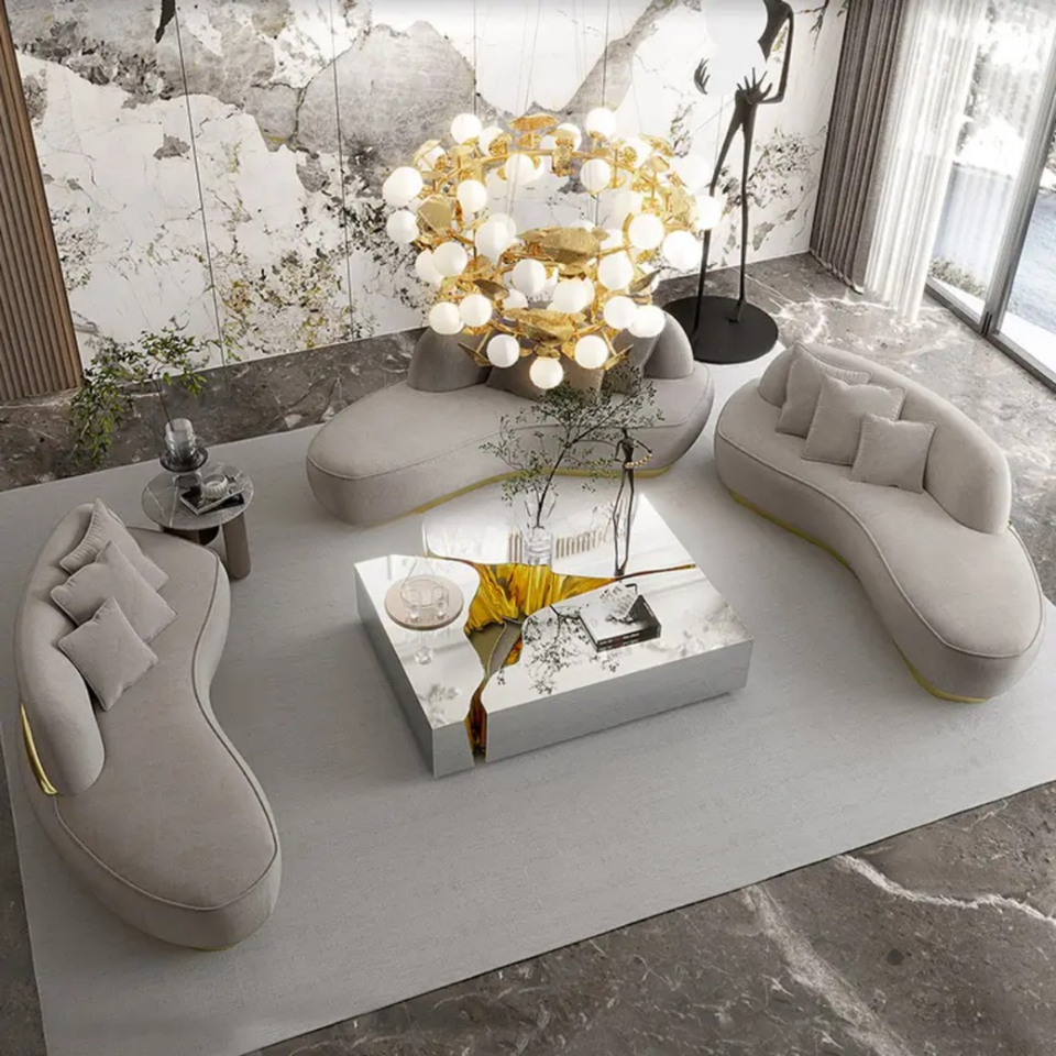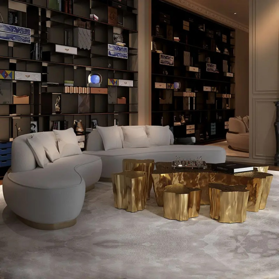 ชุดโซฟาโค้งดีไซน์หรูหราทันสมัย โครงไม้มะฮอกกานี หุ้มเบาะฟองน้ำ สำหรับห้องนั่งเล่น เฟอร์นิเจอร์โรงแรม วิลล่า อินโดนีเซีย