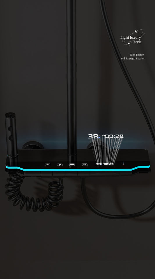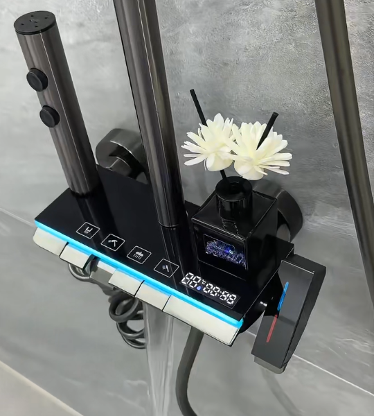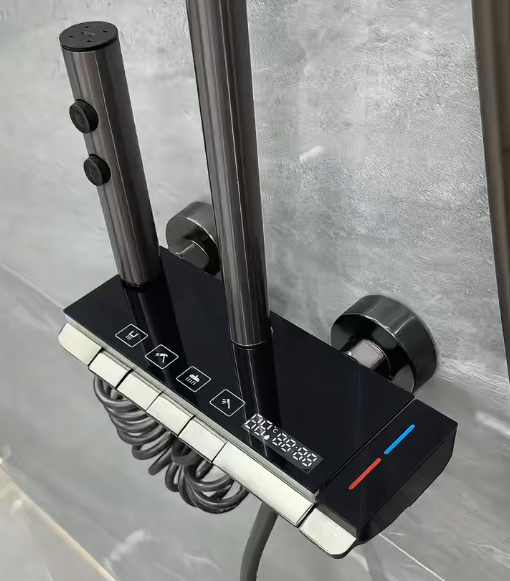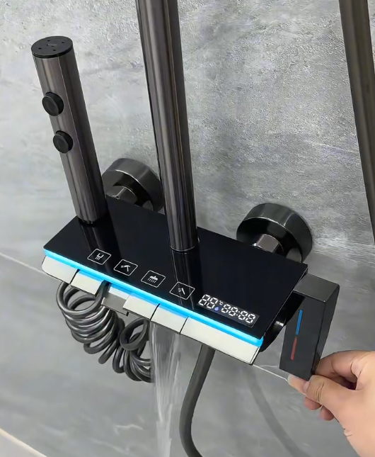 ชุดฝักบัวดีไซน์หรูหราทันสมัย ผลิตจากอะลูมิเนียมสีเทาดำ พร้อมหัวฝักบัวแบบเรนชาวเวอร์และแบบมือถือ ควบคุมการทำงานด้วยปุ่มกดแบบเปียโน