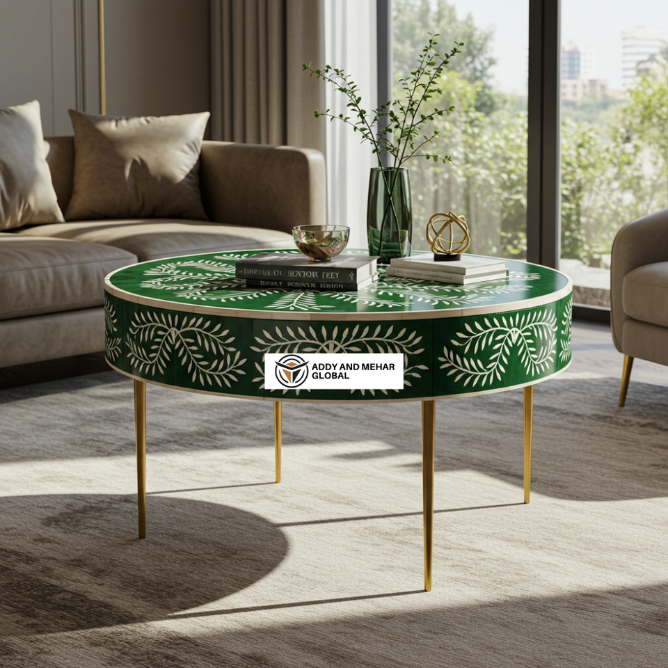 โต๊ะกาแฟทรงกลมท็อปไม้ลายดอกไม้ฝังกระดูกสีเขียวสไตล์โมเดิร์นหรูหราพร้อมฐานโลหะสีทอง